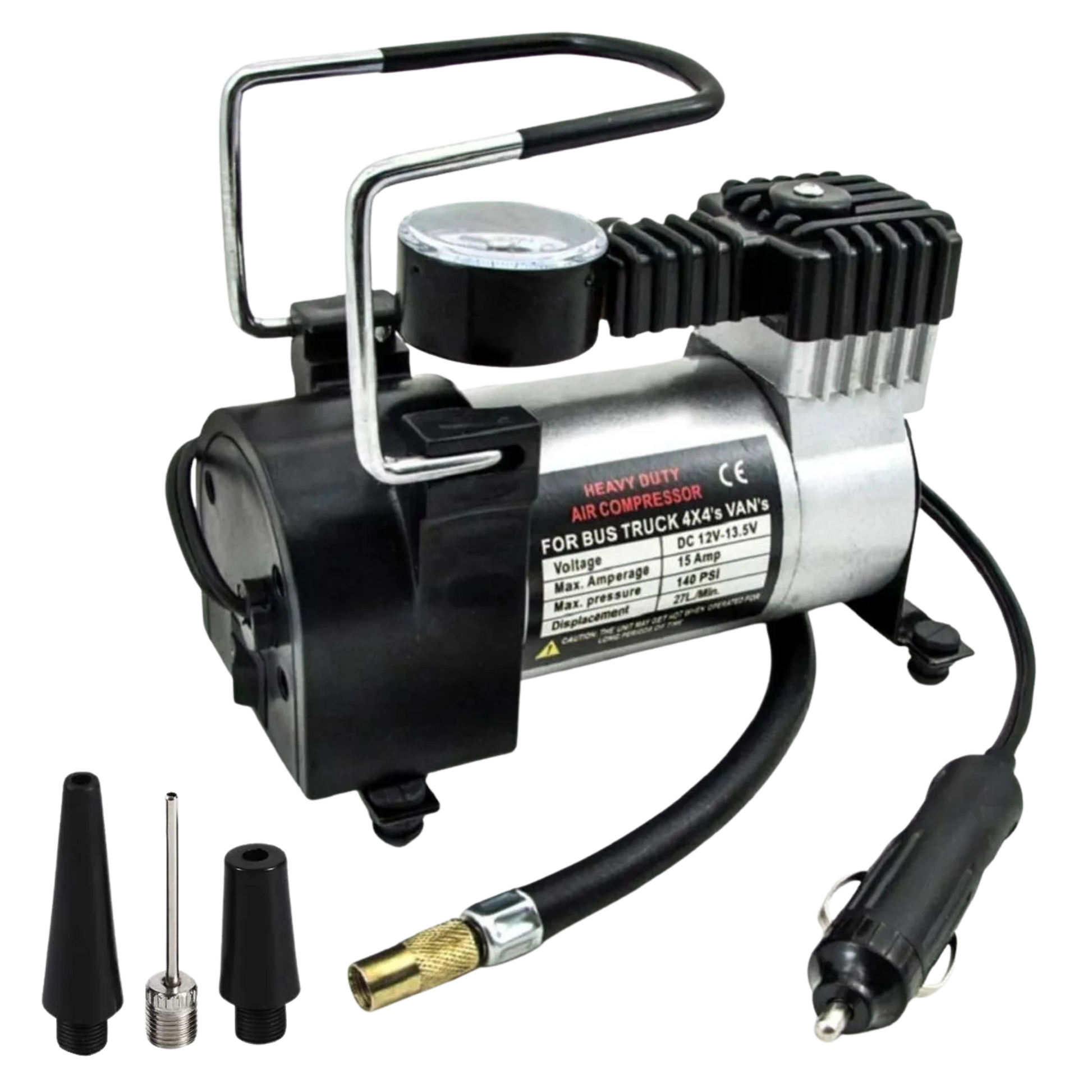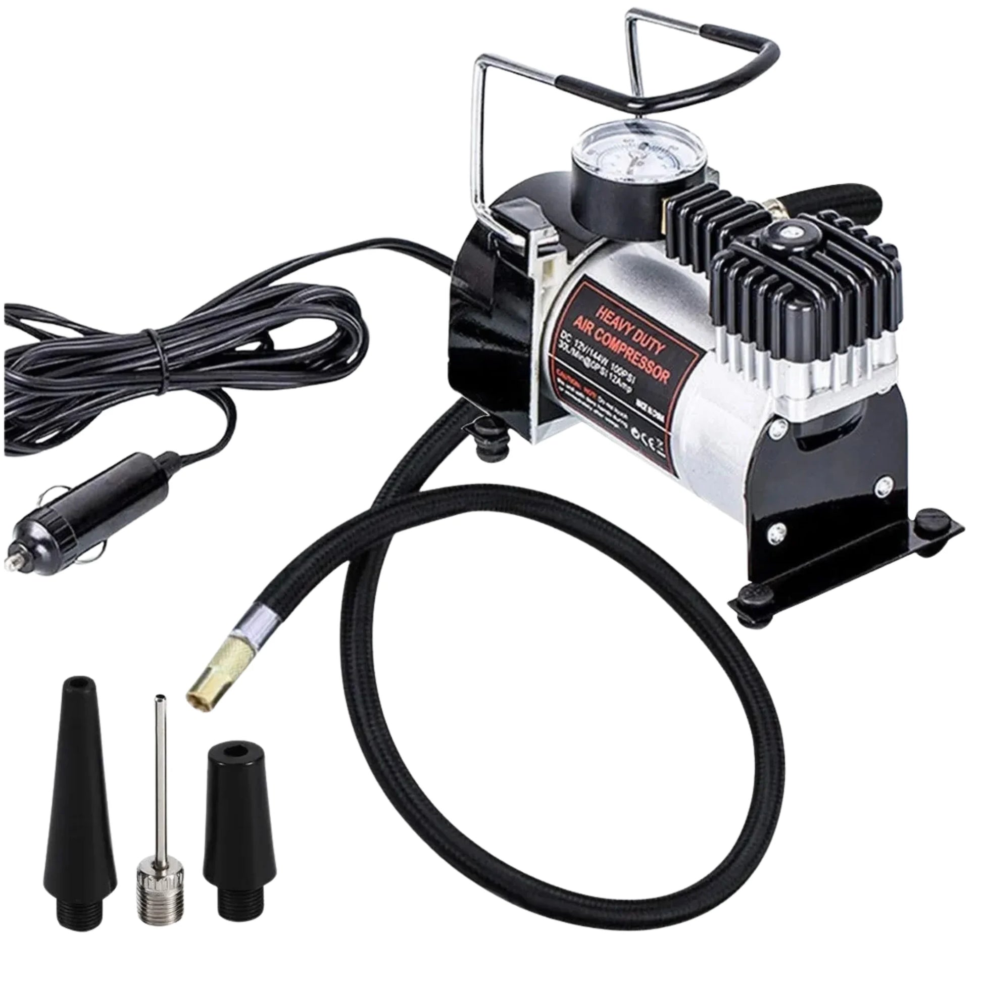 Fabricado con materiales resistentes, posee un motor de 120W y una potencia de inflado de hasta 150 PSI, más que suficiente para neumáticos de autos, motos, bicicletas y otros inflables. Se conecta al encendedor de 12V del vehículo y en pocos minutos resuelve lo que podría ser un gran problema en la ruta.